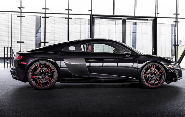 Đúng với tên gọi Panther; phiên bản đặc biệt của Audi R8 RWD 2021 có ngoại thất mang màu đen chủ đạo. Phần gương xe cũng được ốp sợi carbon; logo Audi thay bằng loại hợp kim đen và la-zăng 20 inch 5 chấu kép cũng được phủ sơn đen mờ và viền đỏ.